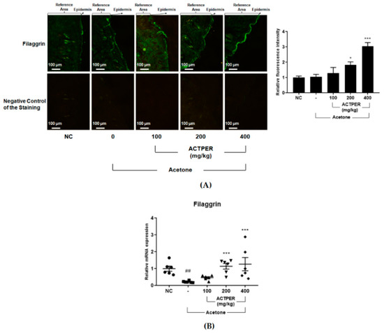 Since filaggrin is one of the key players needed for the maintenance of skin barrier function [13], we investigated ACTPER’s effect on this protein. It was clear that the ACTPER treatment promoted the expression level of filaggrin, as compared to acetone-treated mice in a dose-dependent manner (Figure 4A).