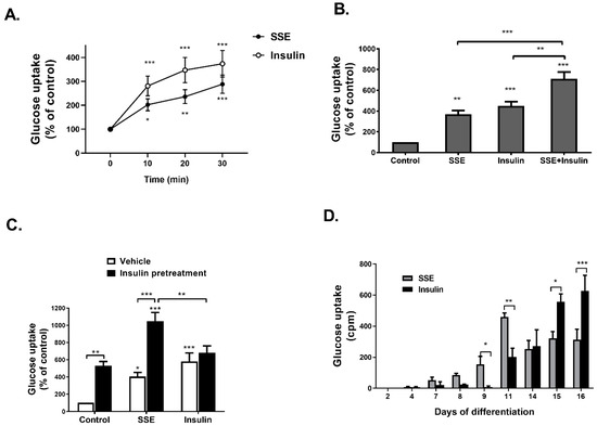 SSE- and insulin-induced glucose uptake in the same time course, with an additive effect. A-C were performed on 3T3-L1 adipocytes at the 14th day of differentiation. (A) 3T3-L1 adipocytes were treated with SSE or insulin for the indicated time before measuring glucose uptake. (B) 3T3-L1 adipocytes were treated with SSE, insulin or both, for 30 min before measuring glucose uptake. (C) 3T3-L1 adipocytes were treated with insulin or vehicle 24 h before treating the cells with either SSE or insulin for additional 30 min before measuring glucose uptake. (D) 3T3-L1 at different days of differentiation were treated with SSE or insulin for 30 min before measuring glucose uptake. In all experiments (A–D), the uptake of [3H]2-Deoxy-D-glucose into cells was determined as described in Material and Methods. The data represent the mean ± SEM of measurement made on six replicates in each of at least five independent experiments. * p < 0.05, ** p < 0.005, and *** p < 0.0005 compared to untreated cells by Student’s t-test (A) or analyzed by one-way ANOVA, followed by Bonferroni’s post-hoc testing (B–D).