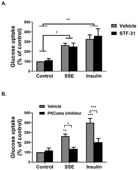 Induction of glucose uptake by SSE is facilitated by Glut4 transporters. (A,B) Differentiated 3T3-L1 adipocytes were treated with 5µM STF31 for 1 h (A) or 50 µM PKCzeta inhibitor (B) for 30 min before treatment with SSE or insulin for additional 30 min. Deoxy-D-glucose in cells was determined as described in Materials and Methods. Data are expressed as percent of basal uptake in control cells. The data represent the mean ± SEM of measurement made on six replicates in each of at least five independent experiments. * p < 0.05, ** p < 0.005, and *** p < 0.0005, analyzed by one-way ANOVA, followed by Bonferroni’s post-hoc testing.