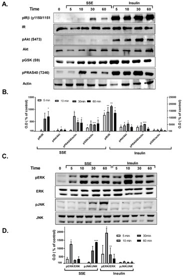Phosphorylation of several proteins, considered to play a key role in the transmission of the insulin signaling cascade, was measured in L6 myotubes and 3T3-L1 adipocytes treated by either insulin or SSE. Insulin binding to its receptor activates two major signaling cascades: the PI3K-Akt pathway and the MAPK pathway. We first followed the effect of SSE on the PI3K-Akt pathway, which is considered to mediate the metabolic effects of insulin. Insulin-induced phosphorylation of insulin receptor (IR), Akt, GSK3β and PRAS40 was rapidly increased following 2 and 5 min of treatment in L6 myotubes (Figure 3A,B) and 3T3-L1 adipocytes (Figure 4A,B), respectively. Unlike insulin, SSE had a very low stimulatory effect on IR phosphorylation in both cell lines, which was somewhat increased during the late stage of induction (10 min in L6 myotubes, 30–60 min in 3T3-L1 adipocytes). Similarly, Akt phosphorylation on ser473, a phosphorylation site considered as a biomarker for Akt activation, was almost undetected in SSE-treated cells. On the other hand, GSK3β and PRAS40 were phosphorylated earlier, following 5 or 10 min of SSE-treatment in L6 myotubes (Figure 3A,B) and 3T3-L1 adipocytes (Figure 4A,B), respectively.