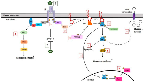 A schematic illustration of the effects of SSE on insulin signaling and the suggested mechanism. SSE induced a low level of IR phosphorylation (1). This phosphorylation might be the result of phosphatase inhibition or a direct binding and activation of the receptor by SSE. SSE activates MAPK pathway in a similar time course as induced by insulin (2). SSE activates the PI3K-Akt pathway (3); although a low level of Akt phosphorylation is detected, Akt is translocated to the membrane and the nucleus (4). Metabolic effects of the PI3K-Akt pathway are regulated by SSE, similar to insulin effects; glucose uptake (5) is increased via Glut4-facilitated transport, while GSK3β is phosphorylated, indicating increased glycogen synthesis (6) and lipolysis inhibition as well (7). In addition, FoxO is phosphorylated and is excluded from the nucleus (8). PRAS40 is also phosphorylated following insulin and SSE stimulation in a PI3K-dependent, Akt-independent mechanism. The scheme is based on results of this study and on our previous data [29,31].