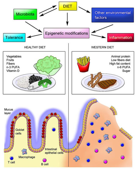 In addition to the direct effects of dietary constituents on epigenetic modifications in human intestinal tissues, the resident microbiota has been shown to alter host histone acetylation and methylation. In this regard, particularly short-chain fatty acids such as acetate, butyrate, and propionate, mostly produced by the microbial fermentation of fiber, appear to play a critical role in the epigenetic control of the inflammatory response. In a diet poor in fiber, the inhibition of SCFA production was correlated with disturbed chromatin effects, which were restored following supplementation with SCFA [145]. In human IBD, SCFA-producing bacteria (Roseburia) and butyrate-producing bacteria (Faecalibacterium) are reduced [146]. However, the application of butyrate-producing bacteria as nutraceuticals in humans has been questioned and needs further investigation [123,147]. Figure 1 summarizes the potential interactions between diet and the microbiota and other environmental factors, resulting in epigenetic modifications, exemplifying the effects of different diets with their respective major characteristics.