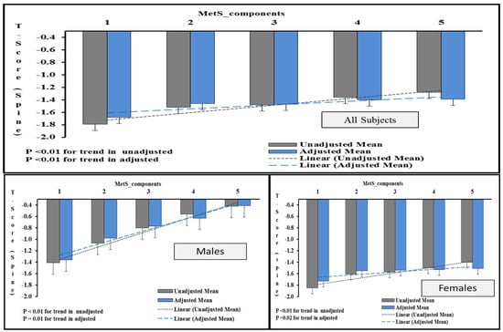 Increasing T-score (spine) values with increasing MetS components according to sex. Note: The figure shows the average T-score (spine) in participants with 1 or more MetS components. The data was generated by univariate analysis by taking T-score (spine) values as dependent variables and “number of components” as factors. The values were adjusted for age, BMI and other risk factors associated with bone loss. p < 0.05 was considered as significant.