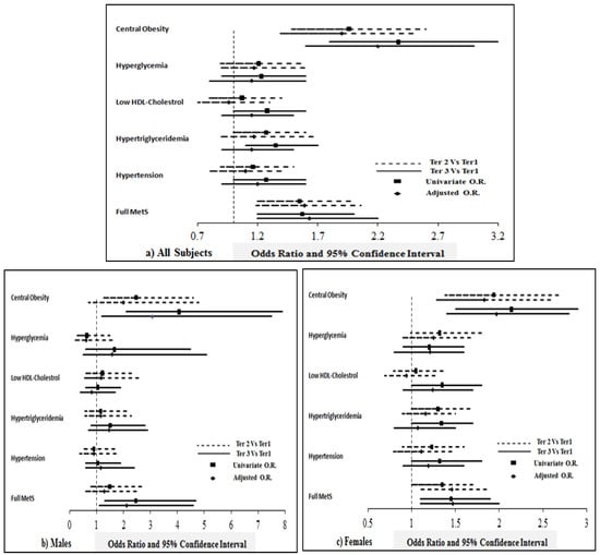 Figure 2 shows the odds ratio and its associated 95% confidence interval of different components of MetS in higher tertiles of T-score (spine) compared with the lowest tertile.