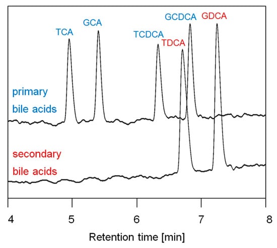 - Tagliacozzi, D.; Mozzi Alessia, F.; Casetta, B.; Bertucci, P.; Bernardini, S.; Ilio Carmine, D.; Urbani, A.; Federici, G. Quantitative analysis of bile acids in human plasma by liquid chromatography-electrospray tandem mass spectrometry: A simple and rapid one-step method. Clin. Chem. Lab. Med. 2003, 41, 1633–1641. [Google Scholar] [CrossRef] [PubMed]