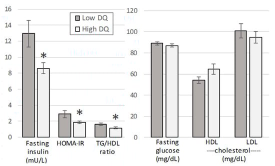 Selected blood biomarkers for diet quality (DQ) groups (low DQ, Rapid Eating and Activity Assessment for Participants Short Version (REAP-S) scores < 37; high DQ, REAP-S scores ≥ 37). Means (±SE) differed significantly by diet quality group (p = 0.042, multivariate test; asterisks indicate the significant differences between low and high diet quality groups following post-hoc analysis).