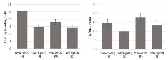 Blood biomarkers differed significantly between the dietary quality groups (p = 0.042, multivariate test controlling for diet group; effect size: 0.463). The mean fasting insulin, HOMA-IR, and TG/HDL ratio differed significantly between the diet quality groups, and the high-quality diet values reached only 62–75% of the low-quality diet values (Figure 1). All significant differences noted between diet quality groups were retained when gender was controlled. Figure 2 displays the fasting insulin and the TG/HDL ratio by four groups: Omnivore/low diet quality, omnivore/high diet quality, vegetarian/low diet quality, and vegetarian/high diet quality (p > 0.05, two-way analysis of variance for diet group × diet quality).