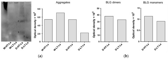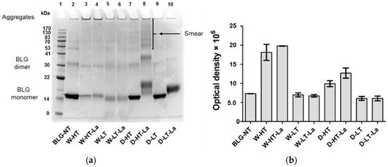 When heated in a wet system, BLG formed high-MW aggregates that did not migrate into the gel. Aggregate formation occurred below (60 °C, Lanes 5–6) as well as above the denaturation temperature of BLG (100 °C, Lanes 3–4); however, they were more abundant when BLG was heated above its denaturation temperature. The relative aggregate quantities, based on the optical density, showed this effect of heating temperature, but not of lactose presence for the wet-heated samples (Lanes 3–4 and 5–6 of Figure 1a, corresponding bars of Figure 1b). Dry-heated BLG aggregates showed 23% higher optical density in the presence of lactose compared to the heating in the absence of lactose, however only when BLG was heated at high temperature.