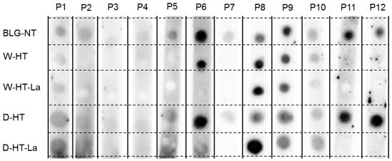 sIgE binding dot blot was conducted to screen the available plasma and sera for their sIgE binding affinity to untreated BLG as well as heated and glycated BLG under wet or dry conditions at high temperatures. The results of the 12 different sera/plasma samples from Table 1 are shown in Figure 7. Based on the dot blot results, the sera were pooled (see Table 2) to perform sIgE western blots.