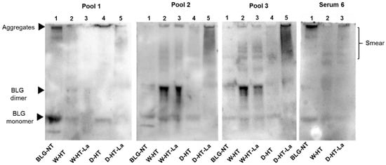 sIgE western blot membranes of unheated BLG (BLG-NT) as well as BLG heated at high temperatures (HT) either under wet (W) or dry (D) conditions, both in the absence of lactose or in the presence of lactose (La). Sera of cow’s milk allergic patients were pooled. Pool 1: Sera 7, 11, 12. Pool 2: Serum 8 and Serum 9. Pool 3: Serum 1 and Serum 10.