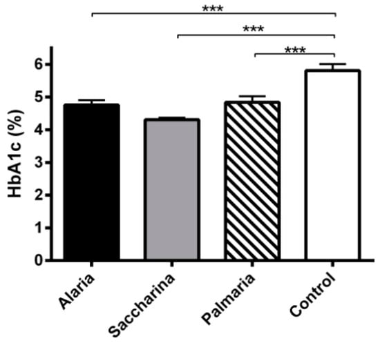 As expected, there were no significant differences in levels of glycated hemoglobin between groups before the intervention (data not shown). At the end of the dietary intervention, the control group had significantly higher levels of glycated hemoglobin (p < 0.001) compared to all of the seaweed groups (Figure 2).
