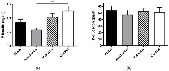 Before the intervention, plasmainsulin levels were similar in the four groups (data not shown). After the intervention, the Saccharina group had significantly lower insulin levels (p < 0.01) (Figure 3a). No significant differences in plasma glucagon were found between groups either at the start (data not shown) or at the end of the intervention (Figure 3b).