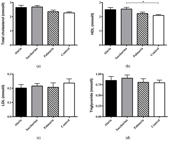 (a) Total plasma cholesterol, (b) HDL cholesterol, (c) LDL cholesterol, and (d) plasma triglyceride levels from the KK-Ay mice at the end of the 11-week intervention with diets supplemented with Alaria esculenta, Saccharina latissimi, or Palmaria palmata compared to chow (control). No significant differences were found for total and LDL cholesterol and triglyceride levels. Plasma HDL was higher for the Saccharina group compared to control * (p < 0.05). Values are means ± SEM.