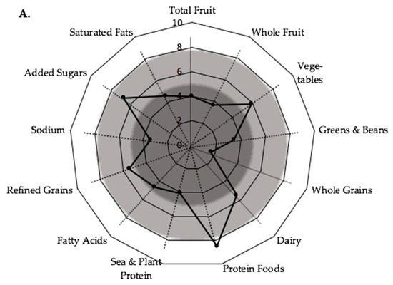 We observed that poor diet quality is due to poor consumption of all food groups, except for protein intake, and thus appropriate interventions require approaches to target all components of the diet, e.g., Mediterranean diet, DASH diet. Nevertheless, our data also identify specific food groups and behaviors that may affect overall diet quality more than others. For example, strategies to reduce high fat intake, e.g., by reducing fast food intake, will likely reduce saturated fatty acid intake, but may also result in less refined grain consumption. Moreover, increasing fruit and vegetable consumption would likely increase dietary fiber and unsaturated fatty acid intake, thus providing a strategy to improve multiple diet quality components. Increasing fiber intake may not only improve satiety and reduce energy intake [44,45], but also improve gastrointestinal health and glucose homeostasis [46].