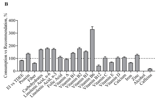 Diet Quality per Healthy Eating Index Components, and Recommendations for Intakes of Macronutrients and Micronutrients. Data are given as mean and mean ± SEM. (A) Values in the dark grey area indicate the respective Healthy Eating Index (HEI) food group to be consumed “poorly” (0–5), values in the light grey area as “needs improvement” (5–8) and in the white area as “sufficient” (8–10), according to the HEI guidelines [25]. HEI components scaled from 0–10 are reported as assessed and components scaled 0–5 were multiplied by two to facilitate comparability between factors. (B) Values are expressed as intake as compared to the minimal macronutrient and micronutrient intake recommendation by the WHO (maximum intake recommendation for alcohol and caffeine). Macronutrient and Micronutrient intake values are adjusted for the degree of underreporting per individual (−16 ± 2% vs. TDEE, adjusted intake=reported intake/reporting accuracy [“EI vs. TDEE”]).