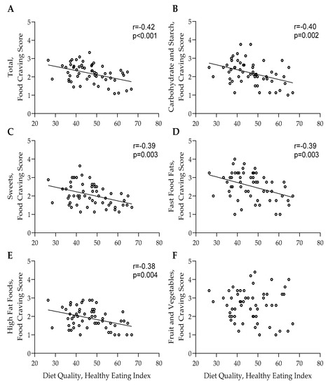 Food Cravings and Diet Quality. Food cravings scores are reported per individual in relation to their respective Healthy Eating Index. Cravings are reported as (A) total cravings and as cravings for (B) Carbohydrates and Starch, (C) Sweets, (D) Fast Food Fats, (E) High Fat Foods and (F) Fruit and Vegetables. Significant associations are indicated by linear regression.