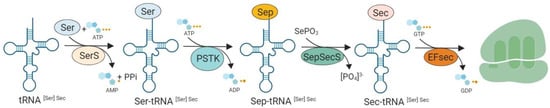 The cycle of selenocysteine synthesis and incorporation in humans begins with the attachment of L-serine to non-cognate tRNASec by seryl-tRNA synthetase, an error that is not edited. This seryl group gets phosphorylated by O-phosphoseryl-tRNASec kinase (PSTK) resulting in phosphoseryl (Sep)-tRNASec intermediate. Finally, this Sep-tRNASec is converted into selenocysteinyl (Sec)-tRNASec through O-phosphoseryl-tRNASec:selenocysteinyl-tRNASec synthase (SepSecS) in the presence of selenophosphate and pyridoxal phosphate. Selenophosphate is the main Se donor in humans synthesized from adenosine triphosphate (ATP) and selenide, the products of selenocysteine degradation, by selenophosphate synthetase (SPS2). A specialized elongation factor (EFsec) then delivers Sec-tRNASec to the ribosome. SElenoCysteine Insertion Sequence (SECIS), located in the 3′-UTR, helps localize EFsec and Sec-tRNASec near the translation site and forms a stem loop structure which is necessary for decoding of selenocysteine UGA codon and its insertion into the nascent protein [,,,]. The cycle of selenocysteine synthesis and incorporation into selenoproteins in humans is summarized in Figure 1.