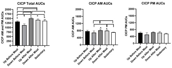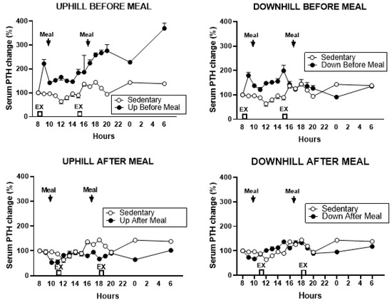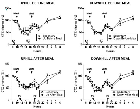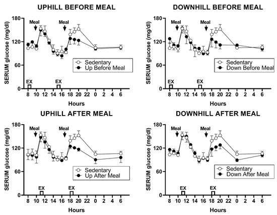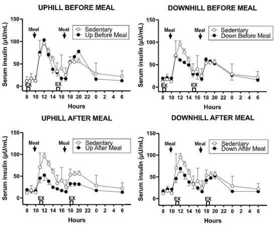| Variable | Sedentary | Uphill Before Meals | Downhill Before Meals | Uphill After Meals | Downhill After Meals | F; p |
