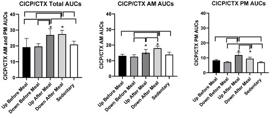 | CICP/CTX AUCs AM | NS | t = 2.73, p = 0.0197 | NS | t = 5.09, p = 0.0003 | t = 5.99, p < 0.0001 | t = 4.58, p = 0.0008 |