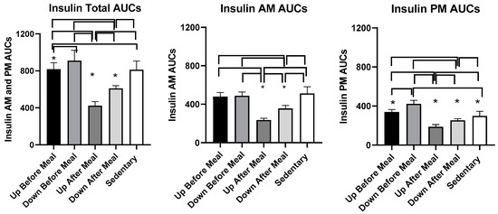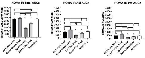 3.4.3. Comparisons Between Exercise-After-Meal and Exercise-Before Meal Insulin and HOMA-IR AUCs (Table 4)