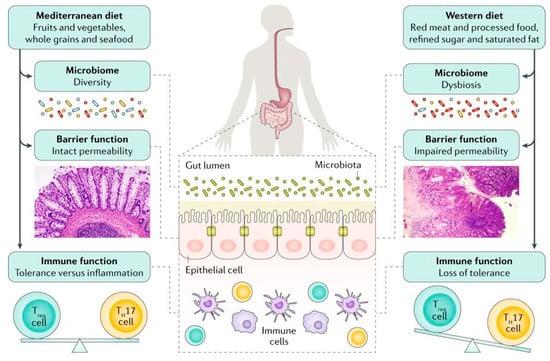 Although the exact mechanisms responsible for the association between diet and development of inflammatory bowel disease is unknown, several mechanisms have been suggested. An unhealthy dietary pattern such as a Western diet has been linked to changes in the gut microbiome and epithelial barrier function and seems to have a direct influence on immune function, triggering a pro-inflammatory environment characterized by an imbalance in the T helper 17 (TH17) cell to regulatory T (Treg) cell ratio [Adapted with permission [11]].