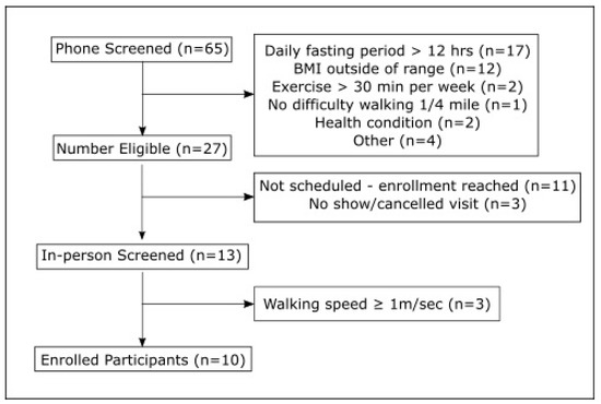 Participants were overweight, sedentary older adults (≥65 years) with mild to moderate functional limitations. Eligibility requirements included men and women aged 65 years and older, self-reported difficulty walking ¼ mile or climbing a flight of stairs, self-reported sedentariness (<30 min structured exercise per week), walking speed < 1 m/s on the 4 m walk test, able to walk unassisted (cane allowed), and have a body mass index between 25–40 kg/m2 (inclusive). Participants who were unwilling or unable to give informed consent or participating in another research project were not accepted. Potential participants were excluded during screening if their phone interview, medical history, or clinical examination revealed any of the following conditions: fasting > 12 h per day, actively trying or planning to lose weight, weight loss >5 lbs. in the past month, resting heart rate of > 120 beats per minute, systolic blood pressure > 180 mmHg or diastolic blood pressure of > 100 mmHg, unstable angina, heart attack or stroke in the past three months, continuous use of supplemental oxygen to manage a chronic pulmonary condition or heart failure, rheumatoid arthritis, Parkinson’s disease, currently on dialysis, active treatment for cancer in the past year, insulin dependent diabetes mellitus, taking medications that preclude fasting for 16 h, or had any condition that in the opinion of the investigator would impair ability to participate in the trial or pose undue personal risk.