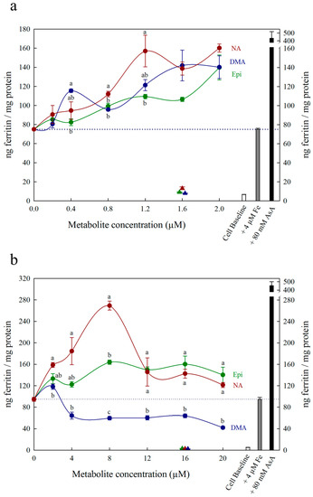 Ferritin formation in Caco-2 cells in response to nicotianamine (NA, red), 2′ deoxymugineic acid (DMA, blue) and epicatechin (Epi, green) at concentrations varying between (a) 0 and 2.0 μM and (b) 0 and 20 µM in solution with Fe (4 µM). Triangles indicate ferritin formation at metabolite solutions (1.6 µM or 16 µM) without Fe. Dotted line indicates ferritin response to 4 μM Fe alone and is extended to both y axes to facilitate comparison with other treatments. Error bars represent standard error of the mean of three replicates. Different letters indicate significantly different ferritin formation between metabolites of the same concentration as analyzed by one-way ANOVA with Tukey post-hoc test (p < 0.05).