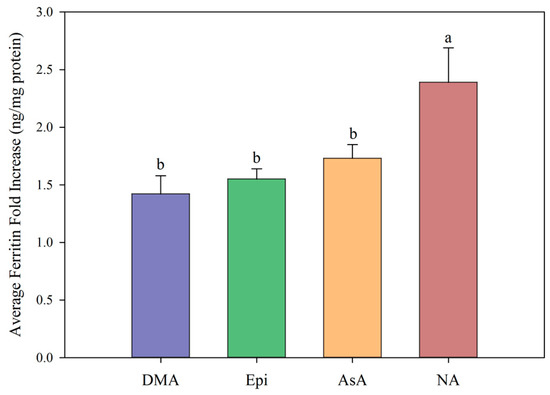 Average fold increase in Caco-2 cell ferritin formation in response to 2′ deoxymugineic acid (DMA, blue), epicatechin (Epi, green), ascorbic acid (AsA, orange), and nicotianamine (NA, red) at Fe:metabolite molar ratios ≤ 1:2 compared to ferritin formation in the presence of Fe alone. Error bars represent standard error of the mean of at least eight replicates. Different letters indicate significant differences between mean fold increase in ferritin formation between metabolites as analyzed by one-way ANOVA with Hsu’s MCB post-hoc test (p < 0.05).
