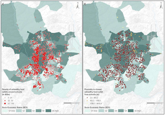 Moreover, area-level socioeconomic status (SES) has been linked to spatial patterns of retailers’ locations. Across the US, according to Zenk et al., schools located in more disadvantaged areas had 32% more fast food retailers than those located in more advantaged areas [30]. In New Zealand, unhealthy food access (within walking distance) was also greater from urban schools located in more deprived areas than from schools located in the leastdeprived areas [22]. Yet, studies conducted across European contexts have shown mixed results. For example, Timmermans et al. found that unhealthy options were the default around schools in the Netherlands [20]. Yet, they found few differences by area-SES level [20]. To date, no research assessing the environment surrounding children and adolescents (e.g., the food environment around schools) has been conducted in Spain. However, retail food environments have been shown to vary widely across geographical settings [31,32,33].