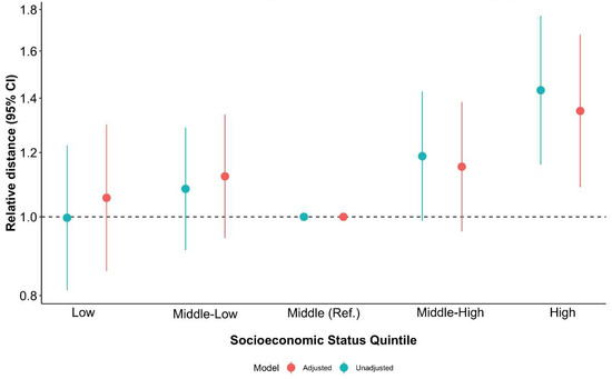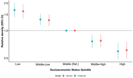 Figure 2 shows the results from the binomial regression model assessing the socioeconomic correlates of unhealthy retailers’ availability. As such, it depicts the results of the models on NSES, both adjusted (in red) and unadjusted (in blue) for population density. Figure 2 illustrates the relative availability: that is, the ratio of the count of food retailers (within 400 m) in each NSES category over the count of food retailers in the middle-NSES quintile.