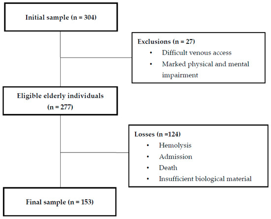 The study was carried out with 304 elderly individuals living in nine Nursing Homes (NH) in the city of Natal (Rio Grande do Norte state), which is in the northeast of Brazil. All the individuals included in the study were at least 60 years old and living in these NHs. In Brazil, the Statute of the Elderly [26] considers elderly individuals to be aged 60 years or older. Elderly individuals who had marked physical and mental impairments, as well as difficult venous access, were excluded from the study. After exclusion, the initial sample of 304 elderly individuals was narrowed down to 153 participants (Figure 1).