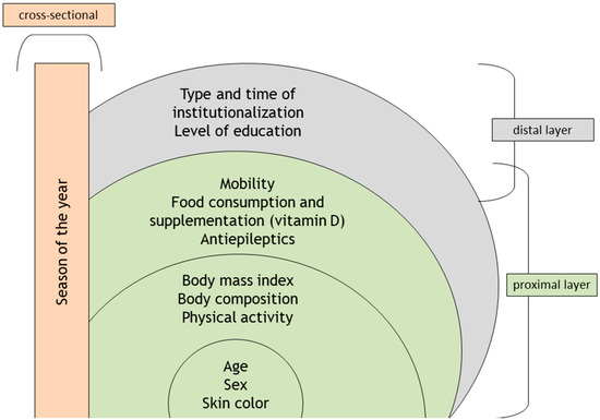 The theoretical model of this study was developed according to determinant factors of vitamin D status. Serum 25(OH)D concentration was defined as the dependent variable, and the independent variables were those likely to influence vitamin D status: Age, sex, skin color, body mass index (BMI), physical activity practice, mobility, diet, use of vitamin D supplements, and use of antiepileptic medications. The sociodemographic, nutritional, lifestyle, and biological variables were included in the “proximal” layers. Type of NH, age-adjusted time of institutionalization, and level of education were components of the “distal” layer. The season of the year was considered as a cross-sectional influence because it has a direct relationship with 25(OH)D concentrations (Figure 2). This study also addressed the relationship between the dependent variable and possible clinical implications in cases of vitamin D-deficient elderly individuals—multimorbidity, falls, sarcopenia, depression, cognition, and functional status.