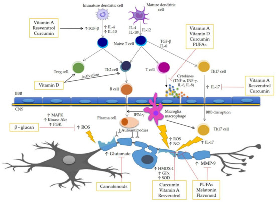 Randomized clinical trials seem to confirm the efficacy of some of the compounds discussed above, such as melatonin, vitamin D3, omega-3 PUFAs, and polyphenol compounds. However, further research is needed in order to understand the potential protective effects exerted by antioxidants on the cellular immunology of MS neurodegeneration. Such studies will not only result in an improved understanding of the disease’s mechanisms, but can also help with the implementation of proper dietary prophylaxis, and the establishment of new goals for innovative treatments providing real therapeutic benefits in MS. The interaction between medical treatment and active compounds contained in the diet should also be taken into account. The Food and Drug Administration (FDA) has approved several types of immunomodulatory pharmacological treatments for MS patients, including IFN-β, FTY, dimethyl fumarate (DMF), and GA. Currently, MS therapy cannot be firmly associated with a particular diet due to the scarcity of information on the effect of nutrition on the disease. Due to the numerous effects of the described compounds on the cells of the immune system and their influence on the production/activity of pro-inflammatory cytokines, possible interactions with the immunomodulatory drugs used in the treatment of MS should be considered.