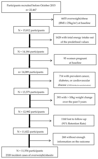 Up to July 2018, there were 22,791 participants who had completed the baseline questionnaire. In order to ensure that all participants had completed at least one follow-up questionnaire, only those who were recruited before October 2015 were considered eligible. Out of the 22,467 eligible participants, we excluded 6655 with prevalent overweight or obesity (body mass index (BMI) ≥ 25 kg/m2) at baseline, 1628 who reported implausible values for total energy intake according to predefined limits (>4000 kcal/d in men and >3500 kcal/d in women or <800 kcal/d in men and <500 kcal/d in women), 95 women who were pregnant at baseline, 714 with prevalent chronic disease (diabetes, cardiovascular disease and/or cancer), and 393 with a weight change > 10 kg in the 5 years before entering the study to reduce the potential source of confounding by other causes of weight changes. Among the remaining 12,982 participants, 1160 were lost to follow-up leaving a total of 11,822 (retention = 91%). Additionally, we excluded 268 participants who had missing values in the variables of interest regarding the outcome. After exclusions, a sample of 11,554 participants was included in this study (Figure 1).