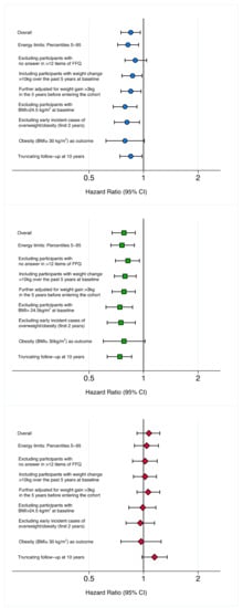 Sensitivity analyses were conducted to assess the robustness of our results under a variety of scenarios (Figure 3 and Table S5). The associations of overall and healthful provegetarian FPs with the risk of overweight/obesity were attenuated when participants with no answer in >12 out of the 136 items included in the baseline FFQ were excluded and when obesity (BMI ≥ 30 kg/m2) was the main outcome considered. Slightly stronger associations were found when participants with baseline BMI > 24.5 kg/m2 were excluded. The adverse association with the unhealthful provegetarian FP became stronger when the follow-up period was truncated at 10 years.