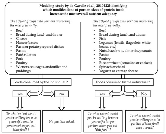 Studies have shown that attitudes and beliefs relative to meat [7,8,9], sensory factors or social norms [10,11] can influence meat intake. Two public health strategies are often adopted to reduce meat intake: encouraging the replacement of meat with plant protein or encouraging a downsizing of portions [12]. Both strategies have been found to be effective in reducing meat purchases or consumption during experimental studies [11,13]. However, most studies based on self-reported data have shown that portion downsizing was more acceptable than replacing meat [14], even if both strategies are acknowledged as being complementary, as it has also been shown that individuals who consume meat less frequently consume smaller portions [12,15]. In nutritional modelling studies using linear optimization, the aim is to identify diets with adequate nutrient intakes, and cultural acceptability is taken into account in a very conservative way by minimizing the distance between modelled diets and observed diets and by setting minimum and maximum limits for the consumption of food groups [16]. Three studies have used more progressive and adaptive approaches to ensure acceptability while modeling diets to increase overall nutrient adequacy by prioritizing changes to portion sizes in individual diets and then introducing new foods if necessary, priority being given to foods frequently consumed by the population [17,18,19]. However, the underlying hypotheses concerning the relative acceptability of these changes, although intuitive, have never been tested with a survey proposing and assessing the acceptability of these changes. Finally, very few studies have explored the dietary changes affecting other food groups than “meat” in general, some pulses and meat substitutes [20,21]. Moreover, these studies did not consider individual background dietary patterns and did not focus specifically on foods where changes were found to improve nutrient adequacy.