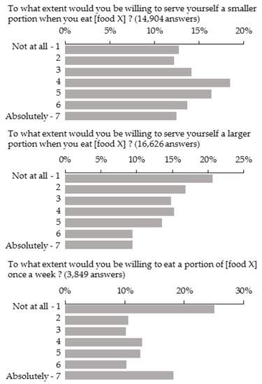 The participants were informed that they would be asked about their willingness to adopt modifications to their dietary habits that would lead to “a more balanced diet”. Willingness to modify the diet was assessed by asking participants to give a score, for each food group, in response to the question “To what extent would you be willing to serve yourself a smaller/larger [depending on the food] portion when you eat [this food]?”, using a seven-point Likert scale from 1 “not at all” to 7 “absolutely”. If a participant self-reported that they never consumed a food group whose portion size had to be increased, he/she was asked “To what extent would you be willing to eat a portion of [this food] once a week?” (Figure 1). There were therefore a total of 10 questions on increasing portion sizes (for the 10 groups whose portions increased the most frequently for improving diet quality, as we previously identified in a nutrition modeling study [22]), 10 questions on reducing portion sizes (for the 10 groups whose portions decreased the most frequently) and 10 questions on introducing a small portion weekly (from the 10 groups whose portions increased the most frequently, if not consumed by the individuals). Some food groups were included in both categories, as increasing or decreasing portions sizes was efficient to increase nutrient adequacy, depending on the individual (e.g., an increase in beef intake led to a higher nutrient adequacy for women with low iron and zinc adequacy but not for men with high iron or zinc adequacy). For each food group, these questions were asked immediately after that concerning the portion size.