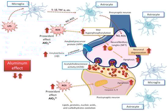 Main central aspects related to neurological mechanisms implicated in Alzheimer’s disease caused by aluminum intoxication. Red arrows indicate the increase of the possible negative effects of aluminum exposure on the brain, those including ROS production increase and, in consequence, rise on tau phosphorylation, apoptosis, amyloid beta peptide (Aβ) accumulation and neurodegeneration. IL-1β, interleukin 1-beta; LPS, lipopolysaccharide; NO, nitric oxide; ROS, reactive oxygen species; TNFα, tumor necrosis factor alpha.