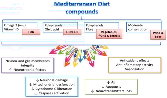 Figure 2 shows some of the Mediterranean diet components from which a positive influence on cognitive health has been described. It has to be pointed out that the effect of the Mediterranean diet is due to its particular foodstuff component, and thus, it appears to be linked to its whole nutrient profile [76,88,89], partially explaining the positive effects of a high Mediterranean diet adherence on brain health [90,91,92,93,94].