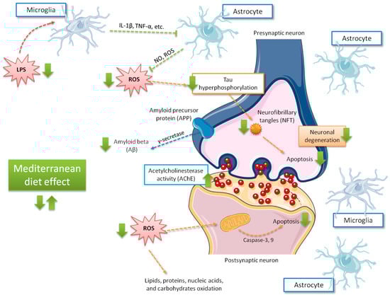Main effects related to Mediterranean diet adherence on cognitive function. Green arrows indicate the increase of the possible effects on brain, those including ROS production decrease and, in consequence, less tau phosphorylation, apoptosis, Aβ accumulation, and neurodegeneration. IL-1β, interleukin 1-beta; LPS, lipopolysaccharide; NO, nitric oxide; ROS, reactive oxygen species; TNFα, tumor necrosis factor alpha.