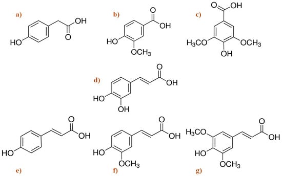 Chemical structure of the main phenolic acids found in beer. (a) 4-hydroxyphenylacetic acid; (b) vanillic acid; (c) syringic acid; (d) caffeic acid; (e) p-coumaric acid; (f) ferulic acid; and (g) sinapic acid [109].