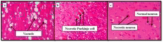 Histological examination of a mouse brain intoxicated with aluminum. (a) Spongiosis but no neuronal necrosis in the positive aluminum control mice; (b) necrosis in the cortex and in the cerebellum of aluminum-intoxicated animals treated with silicon; (c) necrosis of cortical neurons of animals treated with conjoint aluminum and beer [122] (Elsevier copyright license number: 4621240772368).