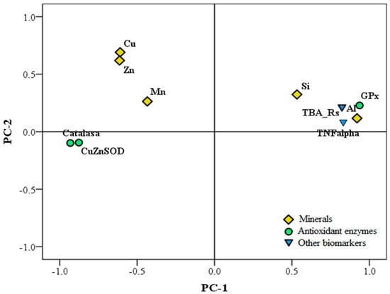 Principal component analysis (PCA) plot of the minerals, oxidation, and inflammation biomarkers of mouse’s brains. The co-administration of aluminum and silicon or beer partially blocked the metal disbalance and reversed the inflammatory and oxidative status in the mouse brain.