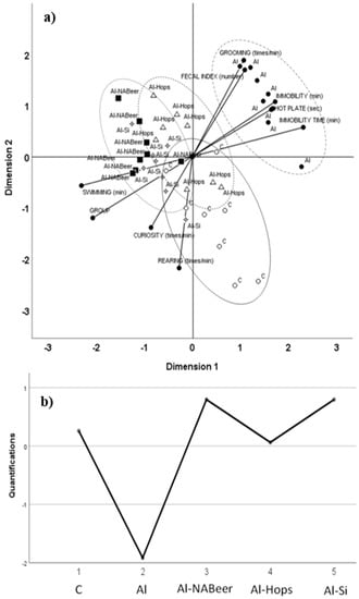(a) Categorical principal component analysis (CATPCA) scatter biplot using groups and nine behavioral variables: rearing, immobility, curiosity, grooming, fecal index, swimming time at the forced swimming test (swimming), immobility time at the forced swimming test, and reaction time (hot plate). (b) Optimal scaling level for the different groups: 1, control group; 2, aluminum-treated group; 3, aluminum plus non-alcoholic beer; 4, aluminum plus hops extract; and 5, aluminum plus silicon. The first and second dimensions accounted for 43.2% and 31.1% of variance, respectively (3.89 and 2.80, respective Eigen values). The ellipses drown surround data for each of the different experimental groups [123].