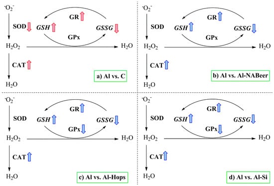 Summary of the main effect of aluminum intoxication on the antioxidant enzymes’ activities and expressions in the rats’ brains [123]. Colored arrows indicate significant differences caused by the aluminum-treated group when compared to the experimental groups. CAT, catalase; SOD, superoxide dismutase; GR, glutathione reductase; GPx, glutathione peroxidase; GSH, reduced glutathione; GSSG, oxidized glutathione. Subsections: (a) comparison between the Aluminium intoxicated group with their control counterparts; (b) comparison between the Aluminium intoxicated group with the Aluminium + Non-alcoholic beer group; (c) comparison between the Aluminium intoxicated group with the Aluminium + Hops extract group; (d) comparison between the Aluminium intoxicated group with the Aluminium + Silicon group.