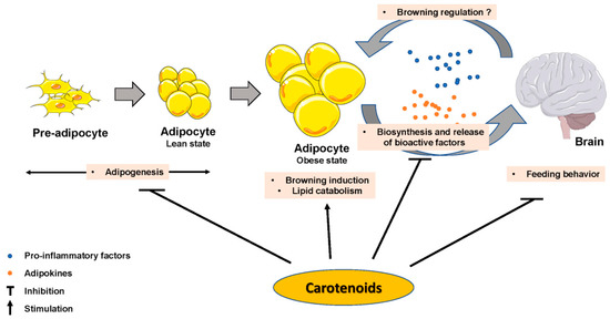 Mounien, L.; Tourniaire, F.; Landrier, J.-F. Anti-Obesity Effect of Carotenoids: Direct Impact on Adipose Tissue and Adipose Tissue-Driven Indirect Effects. Nutrients 2019, 11, 1562. https://doi.org/10.3390/nu11071562