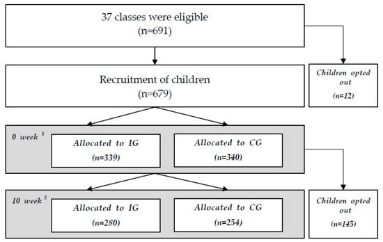 The setting for this study included middle-socioeconomic-class daycares and kindergartens. The Korea Institute of Child Care and Education (KICCE) recruited through daycares and kindergartens by means of a screening process and interviewing the class teachers and directors. Seven daycares and kindergartens (1) located in the Gyeonggi area; (2) with middle-income households; and (3) with healthy 4- to 5-year-old preschoolers were included. The KICCE recruited 37 classes (n = 679) from the 7 daycares and kindergartens by random sampling for the present randomized controlled study. Three to seven classes from each school were randomly divided into the intervention group (IG = 339) or the control group (CG = 340). Two groups (IG and CG) of the participants were from each of the same daycare and kindergarten, by being assigned random numbers, into two groups. Among the children, those (1) who did not want their height and weight measured, (2) or were absent or moves to another area from their school were excluded. All families that completed a consent form (both parent and child) and the questionnaires were enrolled. This study was approved by the institutional review board of The Korea Institute of Child Care and Education (KICCEIRB-2016-03).