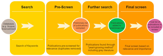 The review follows an adapted approach advocated by Cooper et al. [24]. Published studies (i.e., peer reviewed journal articles/book chapters) were identified through keyword searches in popular search engines i.e., ScienceDirect, Scopus, Google Scholar and Web of Science (Table 1) and subsequently through the “pearl growing” method [24] i.e., identifying highly cited literature from the existing literature sourced and key grey literature i.e., unpublished literature including online reports/project documents. Filtering was also administered according to the authors’ knowledge of the topic/purpose of the review and published literature was stored in Endnote version X9. In addition, the main catalogue/business literature of the British Library was also consulted as well as the main catalogue of the London School of Hygiene and Tropical Medicine (LSHTM) library. The full search procedure is described in Figure 1.