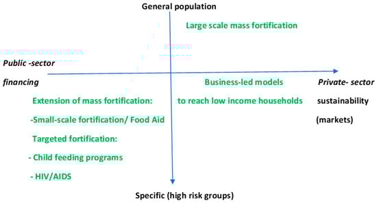 Different regulatory and legal frameworks and products have thus influenced the choice of vehicles used to deliver fortified produce to end users and achieve scale. A variety of delivery models have emerged (Figure 2). The vertical axis shows the degree to which the general population is targeted e.g., from specific (high-risk) groups/ targeted fortification efforts to the general population and larger scale mass fortification. Targeted groups may, for example, include individuals living with HIV that are supported with supplementary feeding programmes with fortified produce (e.g., whilst undergoing antiretroviral therapy) [40,41]. A probiotic fortified yogurt has recently shown promise in being “well tolerated” by people living with HIV in Tanzania (though no association was found with preserving immune function over the study period) this being said, the approach to developing the yogurt in a community-kitchen shows signs of promise for such grass roots nutrition-based approaches [42]. The horizontal axis shows the method i.e., financing i.e., public-sector financing to more business-led models [43] with functioning markets. There are cases where overlapping models exist (e.g., private-public/multi-sector partnerships) that may, for example, be a mass fortification effort but be publicly led and partly privately financed. Whilst some models are also aimed at targeted members of the population e.g., complementary foods for infants (aimed at undernourished), others can be promoted and considered a ‘premium’ brand and only be accessed by those with higher incomes [27].