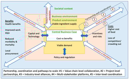 The literature reports various levels of complexity in business models ranging from public to public–private partnerships (with engagement of other stakeholders). These are also related to the level of commitment of the private sector to sustainable development [98]. Four levels are reported ranging from an individual company to a multi-stakeholder institution. Level 1 relates to cooperation with business partners along value chains (this involves minimum involvement from the private sector to sustainable development including nutrition). Level 2 is situated at the project-level i.e., financing and implementation of partnerships; small scale companies linking with other bodies such as investors, governments, philanthropic organisations, NGOs, and research centres. Level 3 is industry-level precompetitive business alliances: association of companies: industries and corporate bodies (this is a more organised approach towards sustainable development). Finally, level 4 consists of multi-stakeholder institution platforms and networks: those can be formal or informal platforms but with a high level of commitment to sustainable goals and development. These can be complex, such as groups or companies collaborating with donors, investors, and academics. One example is GAIN (Global Alliance for Improved Nutrition) [98]. GAIN was funded as a result of a United Nations (UN) initiative in 2002 as a non-profit foundation. It is a platform that helps various nutrition actors—governments, UN agencies, non-governmental organizations, and businesses—to build collaboration in order to tackle malnutrition.